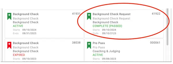 - If, however, you have a “Background Check Request” credential with a status of “COMPLETE (PASSED)” and the “Start” date listed on that credential is between Sept. 1, 2024 and Aug. 30, 2025, then you do not need to pay for a new background check. Rather, you completed a background check during the prior competition season and you simply need to complete a no-cost update during the upcoming season.