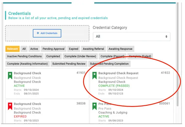 - If, however, you have a “Background Check Request” credential with a status of “COMPLETE (PASSED)” and the “Start” date listed on that credential is between Sept. 1, 2024 and Aug. 30, 2025, then you do not need to pay for a new background check. Rather, you completed a background check during the prior competition season and you simply need to complete a no-cost update during the upcoming season.